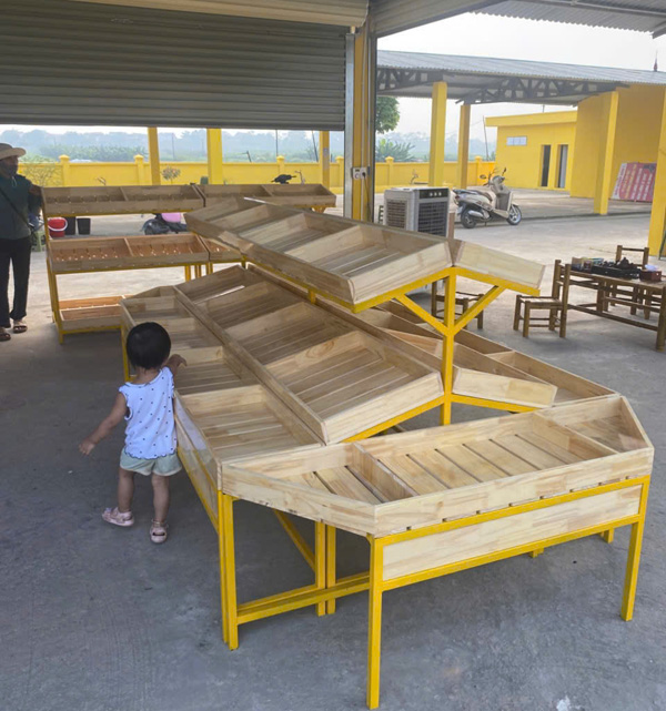 Hệ thống giá kệ khung sắt khay gỗ thông cho cửa hàng rau củ, thực phẩm sạch