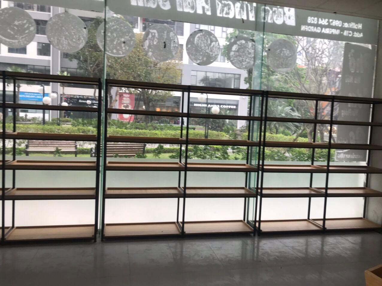 Kệ bày hàng hóa nhiều tầng trưng bày sát vách kính